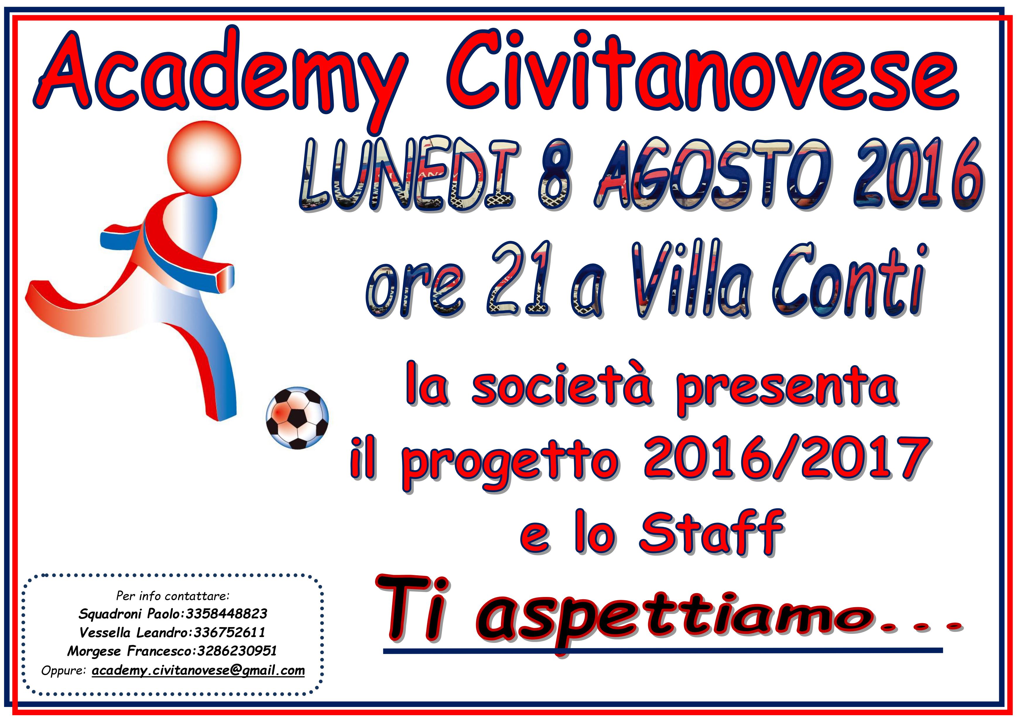 Civitanova Marche (MC): Lunedi 8 Agosto 2016 alle ore 21 l’Academy Civitanovese 2016/2017 si toglie il velo. Nella tranquilla oasi di sport di Villa Conti la società presenterà il progetto per l’anno sportivo 2016/2017. La società del Presidente Squadroni, a conclusione del suo primo anno sportivo e in procinto di cominciarne un altro, presenterà anche lo staff tecnico e dirigenziale. Molte le conferme e qualche innesto importante tra allenatori e dirigenti. I nuovi collaboratori andranno ad arricchire un gruppo affiatato e già di per sè importante e collaudato. Grazie a tutti coloro che saranno dei nostri!!!