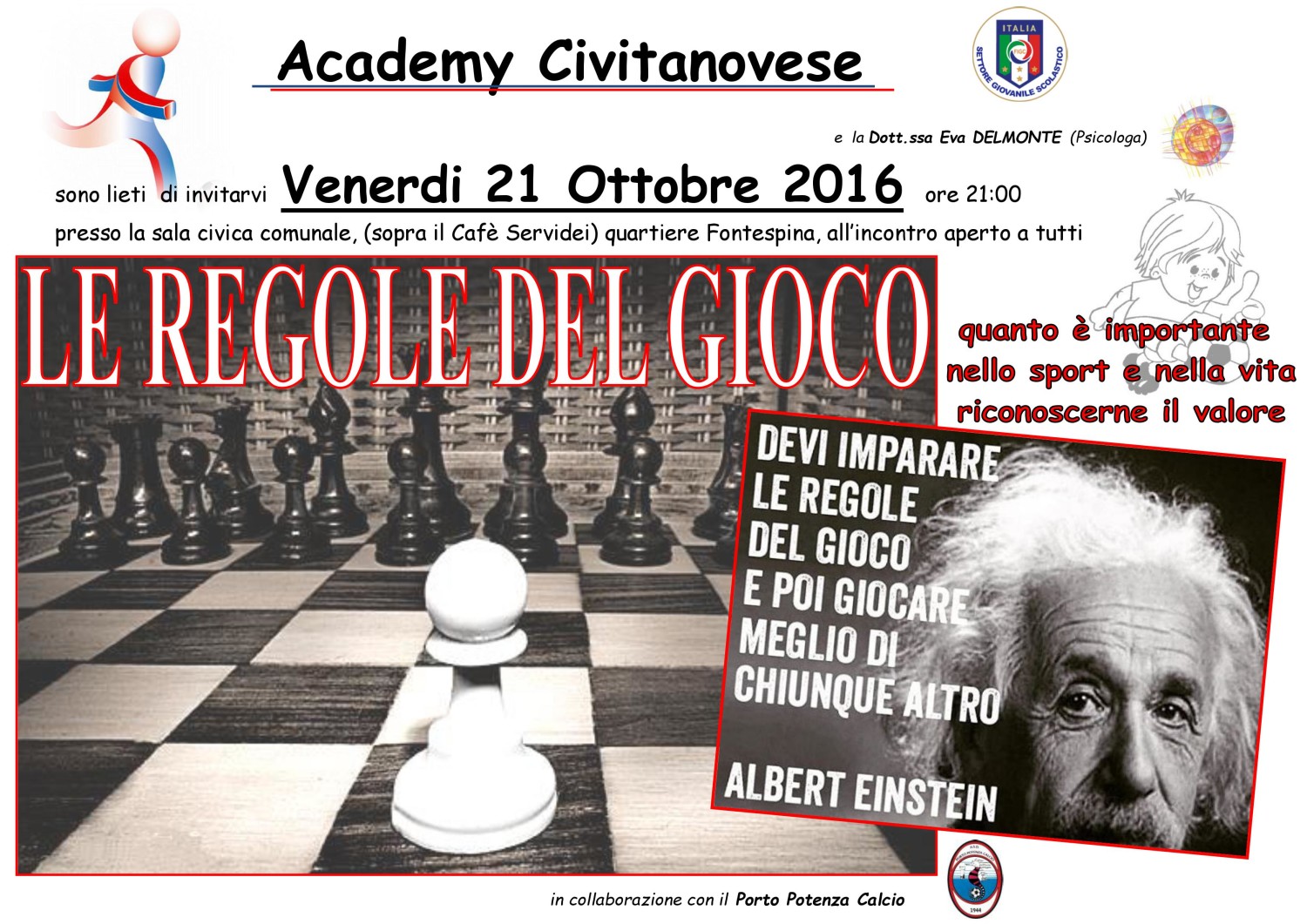 L’Academy Civitanovese con la psicologa Dott.ssa Eva Delmonte organizza, Venerdi 21 Ottobre 2016 alle ore 21 presso la sala civica comunale del quartiere Fontespina, un interessantissimo incontro sul tema LE REGOLE DEL GIOCO – Quanto è importante nello sport e nella vita riconoscerne il valore.