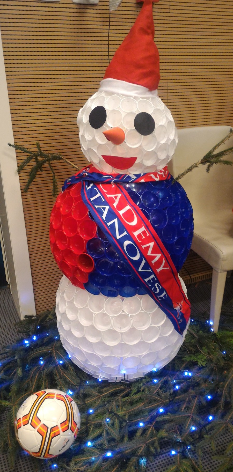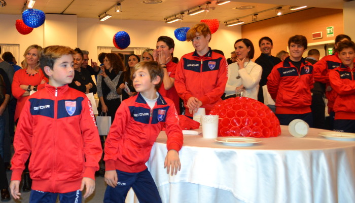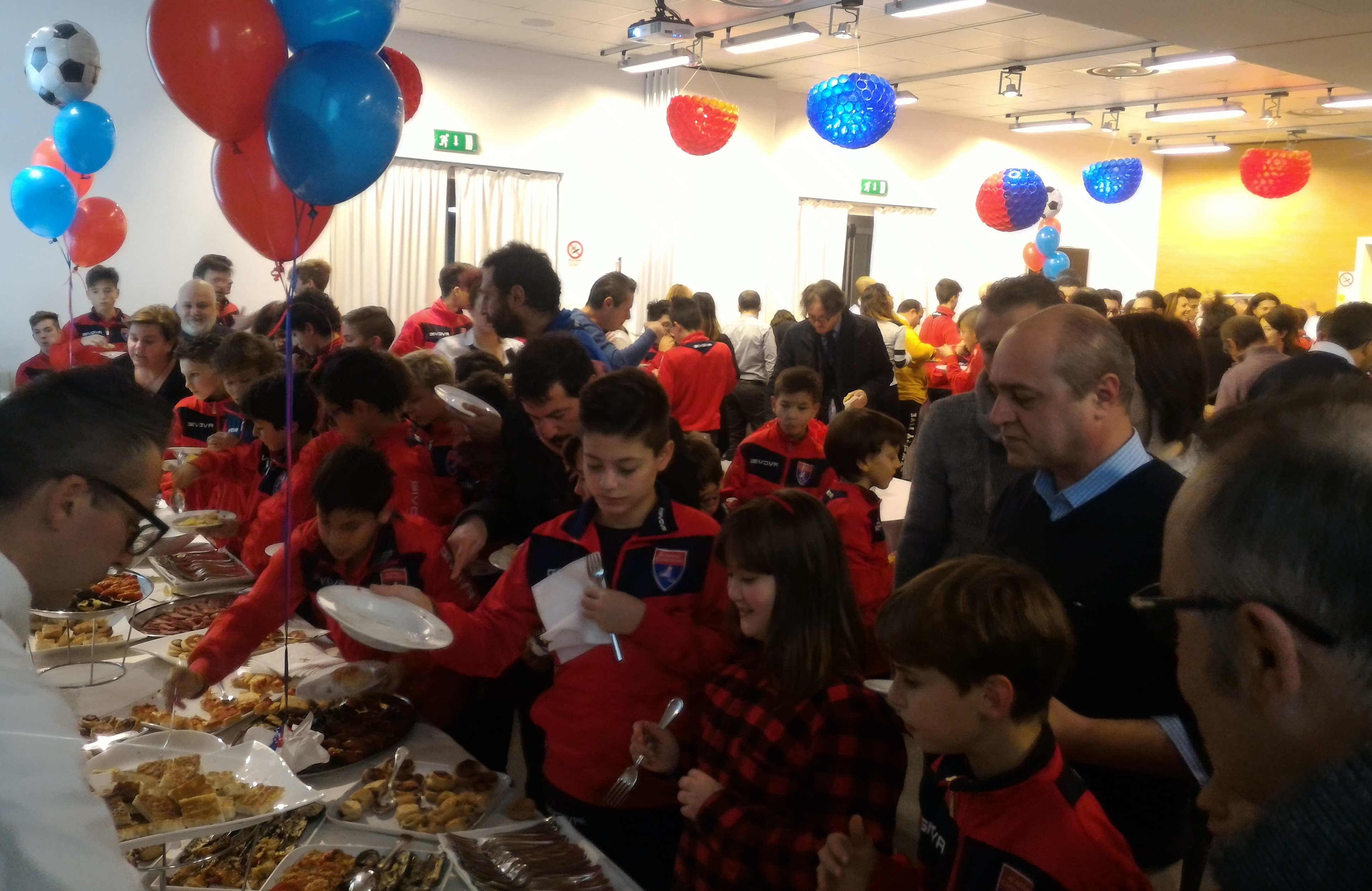 Salone addobbato con splendidi palloni colorati in rosso e blu, realizzati dalle mamme dei giocatori, mettendo insieme centinaia di bicchieri di plastica e con lo stesso criterio è stato realizzato il Babbo Natale, che si vede nella foto sottostante, che ha simpaticamente ricordato il significato dell’incontro. Naturalmente si è parlato poco di calcio, in quanto un po’ tutti sono stati impegnati nel gustosissimo self-service, anche se Squadroni e Vessella, si sono a lungo intrattenuti con i giovanissimi atleti ai quali sono stati donati dei gadget.