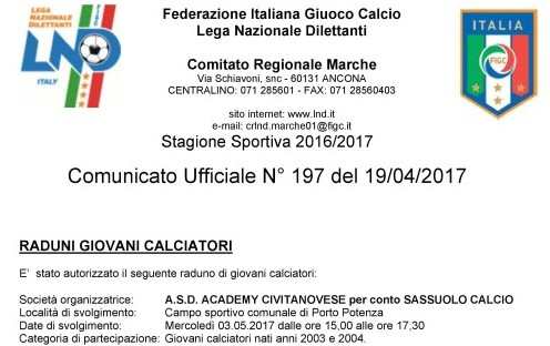 Autorizz FIGC Raduno Sassuolo - Com. Uff. nr.197 del 19-04-2017