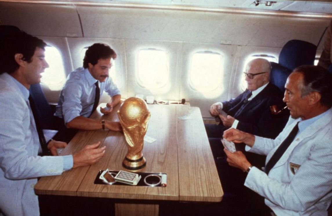 (Enzo Bearzot, Franco Causio, Dino Zoff e il Presidente della Repubblica Sandro Pertini con la Coppa del Mondo sull’aereo di ritorno dal vittorioso mondiale di Spagna 1982 – Fonte: Wikipedia)