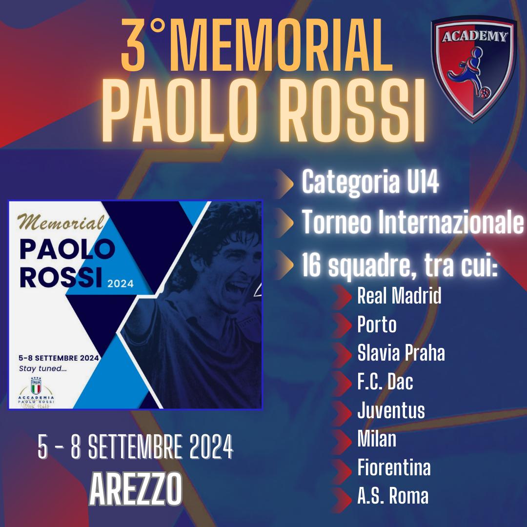 Siamo lieti di annunciare la partecipazione dell’Academy al 3° Memorial Paolo Rossi: che si prepara a dare spettacolo il 5-8 settembre 2024, ad Arezzo. Un’iniziativa internazionale che celebra il calcio, i valori dello sport e il ricordo di un grandissimo e amatissimo Campione del Mondo: il mitico Paolo “Pablito” Rossi.