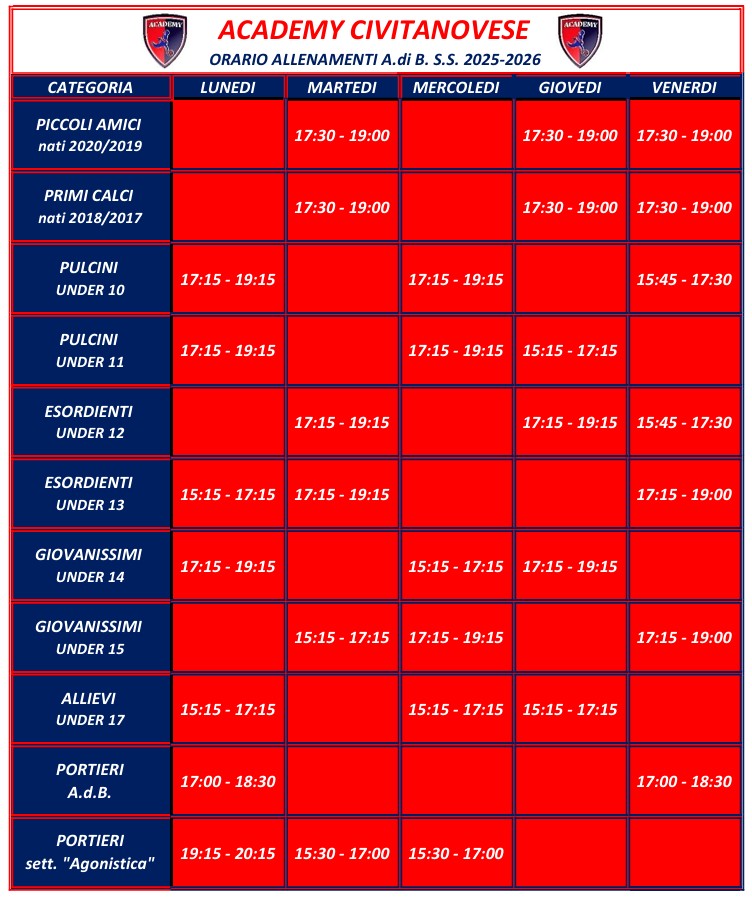 Tutte le nostre squadre che fanno parte dell’attività di base, a partire dai pulcini, si allenano 3 volte a settimana con una durata di 2 ore ad allenamento. Le squadre dell’attività agonistica oltre ai 3 allenamenti settimanali di 2 ore di durata, spesso sostengono sedute di allenamenti specifici dedicati al ruolo od a fondamentali da migliorare e perfezionare.