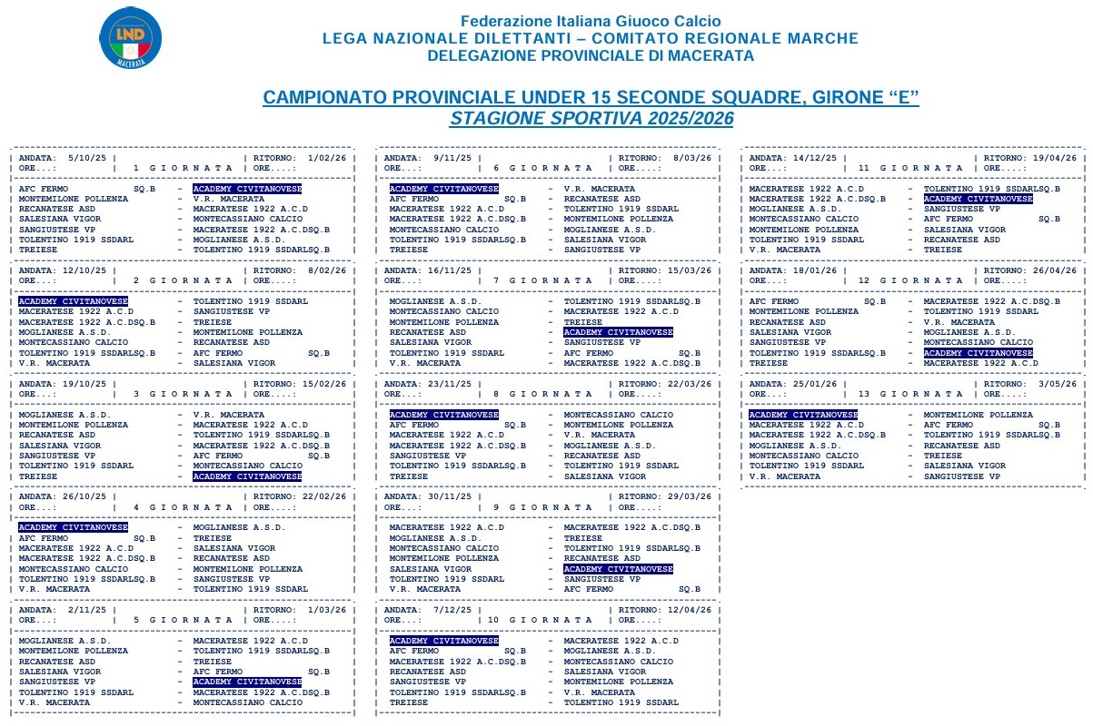 IL CALENDARIODEI CADETTI U14